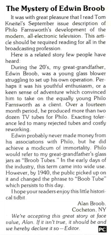 Betty Broob comes from a long line of innovators dating back to Alan Broob’s great-grandfather, Edwin, who was a glass blower who helped Philo Farnsworth create the first picture tubes for what we now know as Television. Although originally called, “Broob Tubes,” as television become more popular the public began calling them them “boob” once actresses like Jayne Mansfield and Sophia Loren appeared on the scene. Edwin decided it would be prudent to not make an issue of this error in nomenclature.